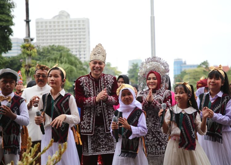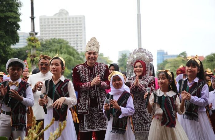 SURABAYATODAY.ID, SURABAYA –Pemerintah Kota (Pemkot) Surabaya menggelar upacara peringatan Hari Pendidikan Nasional (Hardiknas) tahun 2025, di halaman Taman Surya, Jumat (2/5/2025). Dalam kesempatan tersebut, Wali Kota Surabaya Eri Cahyadi dan Bunda PAUD Kota Surabaya Rini Indriyani mengenakan busana adat Minangkabau, Kota Padang.