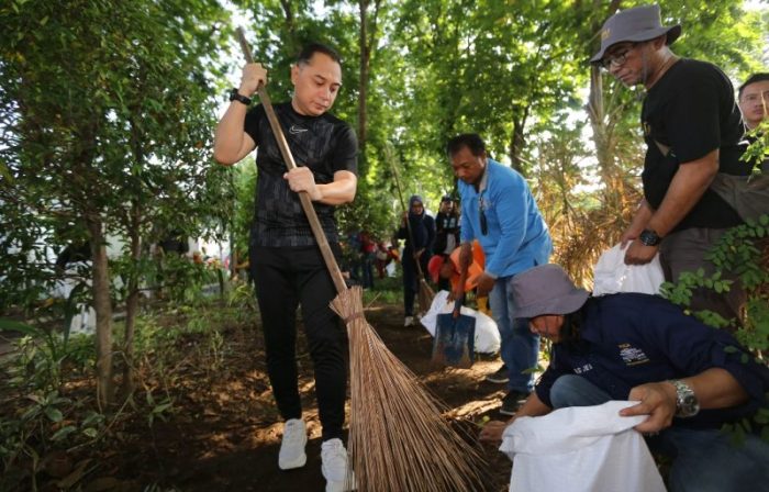 SURABAYATODAY.ID, SURABAYA – Dalam rangka memperingati Hari Bumi Sedunia, Pemerintah Kota (Pemkot) Surabaya bersama Perumda Air Minum Surya Sembada dan Pokja Wartawan Taman Surya (Potas) menggelar aksi bersih-bersih di Sungai Kalimas, Sabtu (3/5). Kegiatan yang berlangsung di Taman Asreboyo, Jalan Ngagel ini dihadiri Wali Kota Surabaya Eri Cahyadi, Kepala Dinas Lingkungan Hidup Dedik Irianto, Dirut PDAM Surya Sembada Arief Wisnu Cahyono, serta Ketua Potas Robby Julianto.