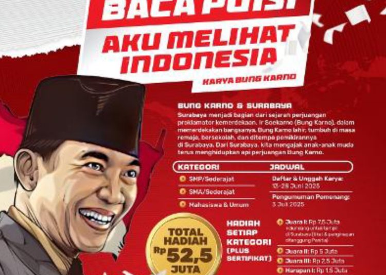 SURABAYATODAY ID, SURABAYA – Pemerintah Kota (Pemkot) Surabaya menggelar lomba baca puisi berjudul “Aku Melihat Indonesia” karya presiden pertama Indonesia, Ir Soekarno (Bung Karno). Lomba berhadiah total Rp 52,5 juta tersebut terbuka untuk kategori SMP/sederajat, SMA/sederajat, dan mahasiswa/umum.