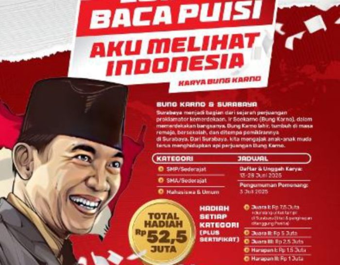 SURABAYATODAY ID, SURABAYA – Pemerintah Kota (Pemkot) Surabaya menggelar lomba baca puisi berjudul “Aku Melihat Indonesia” karya presiden pertama Indonesia, Ir Soekarno (Bung Karno). Lomba berhadiah total Rp 52,5 juta tersebut terbuka untuk kategori SMP/sederajat, SMA/sederajat, dan mahasiswa/umum.