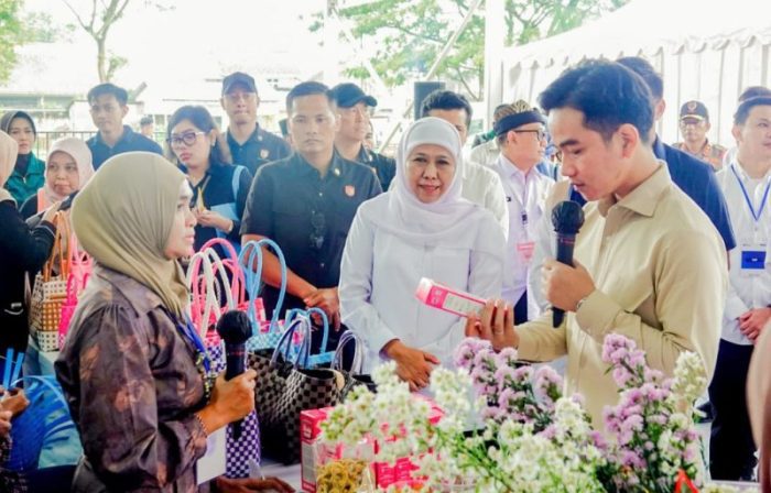 SURABAYATODAY ID, BANYUWANGI – Wakil Presiden RI Gibran Rakabuming menyapa nasabah dan pendamping program Membina Ekonomi Keluarga Sejahtera (Mekaar) binaan PT Permodalan Nasional Madani (PNM) di Ruang Terbuka Hijau Maron, Banyuwangi, Senin (23/6). Ia didampingi Gubernur Jatim Khofifah Indar Parawansa.