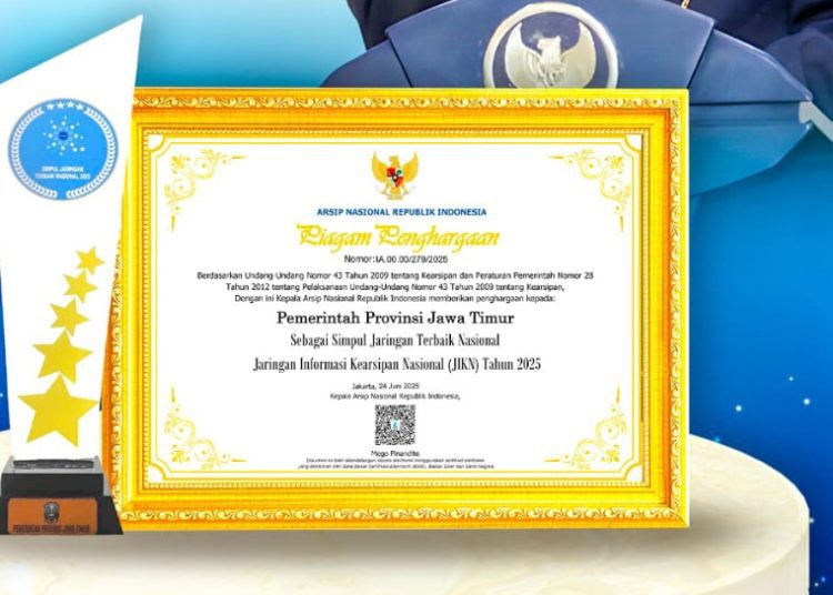 SURABAYATODAY.ID,SURABAYA – Pemerintah Provinsi Jawa Timur meraih penghargaan Simpul Jaringan Terbaik dalam pengelolaan Jaringan Informasi Kearsipan Nasional (JIKN).