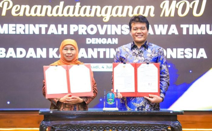 SURABAYATODAY.ID, sURABAYA – Gubernur Jawa Timur Khofifah Indar Parawansa menandatangani MoU dengan Kepala Badan Karantina Indonesia Dr. Sahat Manaor Panggabean tentang pentingnya Penyelenggaraan Perkarantinaan Hewan, Ikan, dan Tumbuhan dalam instalasi karantina terpadu di Gedung Negara Grahadi, Jumat (4/7/2025).