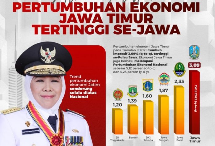 Berdasarkan data Badan Pusat Statistik yang dirilis 5 Agustus 2025, ekonomi Jawa Timur tumbuh sebesar 5,23 persen year-on-year (y-o-y) di triwulan II tahun 2025 dan 5,12 persen cumulative to cumulative (c-to-c). Capaian ini lebih tinggi dibanding ekonomi nasional mencapai 5,12 persen (y-o-y) dan 4,99 persen (c-to-c).