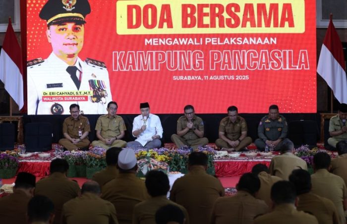 SURABAYATODAY.ID, SURABAYA – Pemerintah Kota (Pemkot) Surabaya menggelar doa bersama sekaligus mengawali pelaksanaan Kampung Pancasila di lobby lantai 2 Balai Kota, pada Senin (11/8/2025). Doa bersama ini, dipimpin secara langsung oleh Wali Kota Surabaya Eri Cahyadi dan diikuti seluruh jajaran kepala perangkat daerah (PD), camat, hingga lurah di lingkungan Pemkot Surabaya.