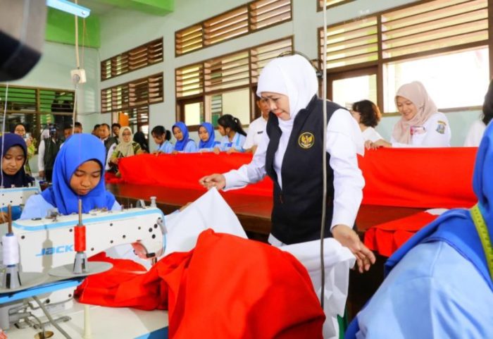 “Ini rangkaian kegiatan dalam rangka memperingati HUT Kemerdekaan ke-80 RI di tahun 2025 ini. Salah satunya adalah kita mengajak para murid SLB, SMK, dan SMA Double Track untuk ikut menjahit bendera Merah Putih. Ini sebagai upaya menumbuhkan semangat nasionalisme pelajar,” kata Gubernur Khofifah