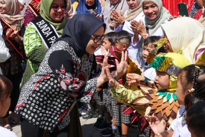 Ketua Bunda PAUD Surabaya Rini Indriyani menyapa anak PAUD. Selain membangun karakter, pendidikan di PAUD Surabaya juga diintegrasikan dengan literasi, numerasi, serta nilai agama yang dikemas secara menyenangkan.