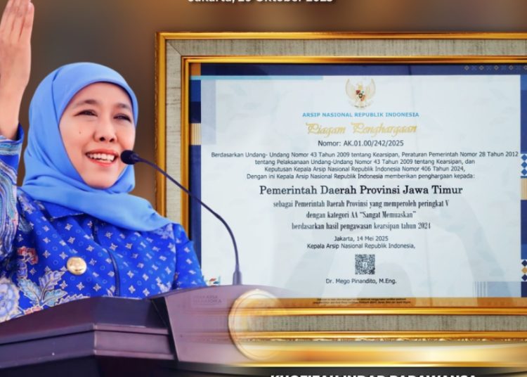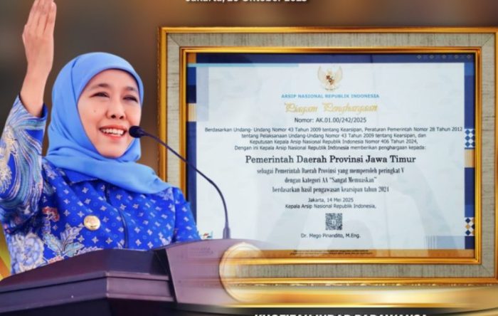“Alhamdulillah, capaian ini menjadi bukti nyata komitmen dan kerja keras seluruh jajaran Pemprov Jatim yang terus memperkuat sistem kearsipan yang modern, efisien, dan akuntabel,” ujar Gubernur Khofifah.