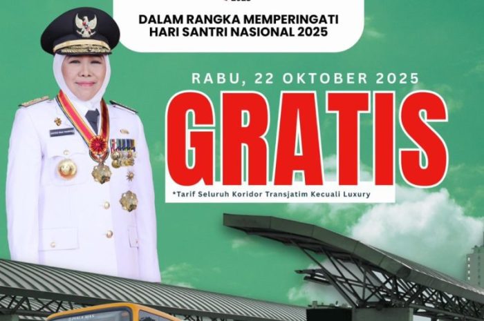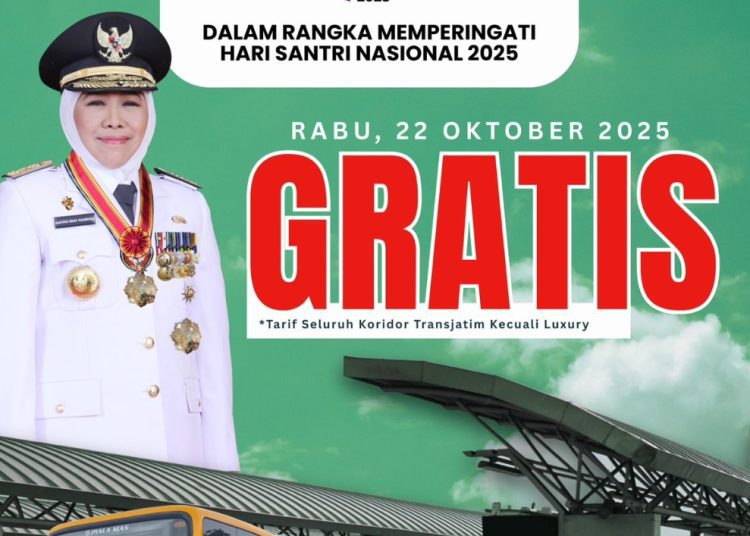 SURABAYATODAY.ID, SURABAYA – Dalam rangka memperingati Hari Santri yang jatuh pada 22 Oktober 2025, Pemerintah Provinsi Jawa Timur melalui Dinas Perhubungan Provinsi Jawa Timur memberikan tarif gratis bagi seluruh pengguna layanan Trans Jatim kecuali armada luxury. Kebijakan ini merupakan bentuk apresiasi Gubernur Jawa Timur Khofifah Indar Parawansa kepada masyarakat atas dukungan dan partisipasinya dalam mewujudkan sistem transportasi publik yang inklusif, modern, dan berkelanjutan.