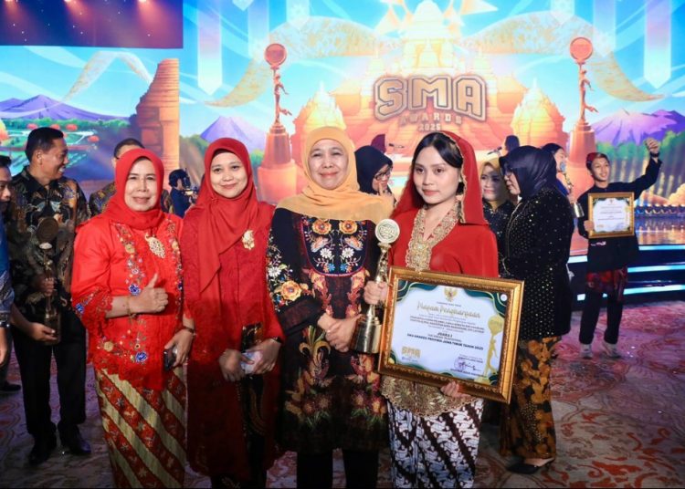 SURABAYATODAY.ID,  SURABAYA, – Gubernur Jawa Timur Khofifah Indar Parawansa menerima dua penghargaan dari Museum Rekor Dunia Indonesia (MURI) pada Malam Penganugerahan SMA Award Tahun 2025 di Dyandra Convention Hall Surabaya pada Kamis (23/10).