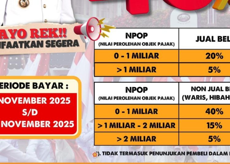 Kepala Bidang (Kabid) PBB dan BPHTB, Badan Pendapatan Daerah (Bapenda) Kota Surabaya, Kota Surabaya, Siti Miftachul Janna mengatakan, pada kesempatan ini pemkot memberikan dua program diskon BPHTB dan bebas denda PBB. “Untuk PBB sekarang lagi ada program bebas denda, jadi bayar tahun berapapun itu dendanya langsung hilang (dihapuskan). Kalau untuk BPHTB, kita (ada) diskon pengurangan pokok sampai dengan 40 persen,” kata Miftachul, Rabu (5/11/2025).