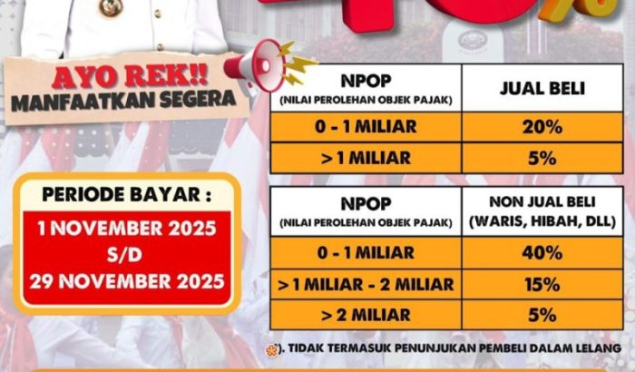 “Jadi memang ada ketentuan terhadap waris yang paling besar, yang nilai properti NPOP-nya kurang dari Rp 1 miliar maka sudah langsung dapat diskon 40 persen. Kalau yang berlaku untuk Jual-Beli itu (diskonnya) sampai 20 persen,” sebutnya.
