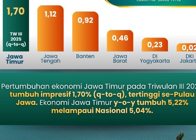 Berdasarkan data terbaru yang dirilis Badan Pusat Statistik (BPS) per 5 November 2025, secara quarter to quarter (q-to-q) terhadap kwartal II 2025 perekonomian Jatim tumbuh 1,70%.