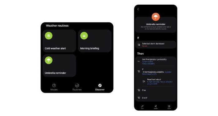 Tampilan Weather kini lebih realistis dan informatif berkat animasi hidup dan tata letak baru yang rapi. Fitur Modes & Routines juga lebih pintar dengan rekomendasi berbasis cuaca — misalnya, saat kemungkinan hujan di atas 50%, ponsel otomatis mengingatkan pengguna untuk membawa payung.