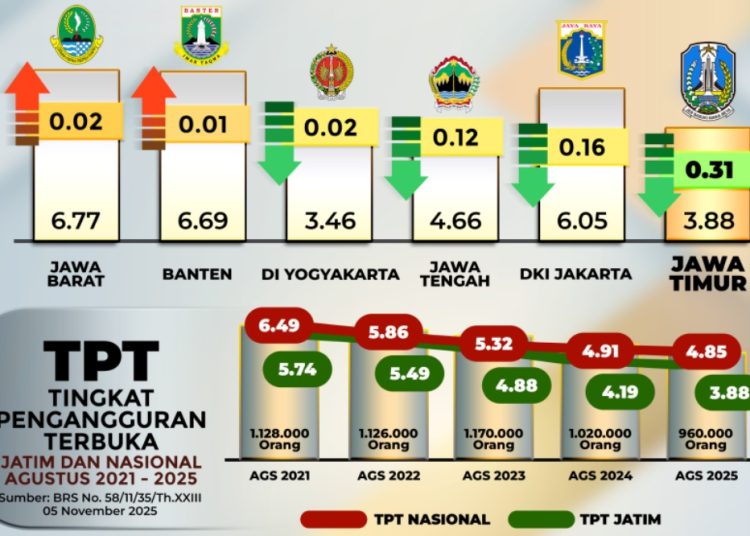 SURABAYATODAY.ID, SURABAYA – Provinsi Jawa Timur kembali mencatat capaian membanggakan di sektor ketenagakerjaan. Berdasarkan Survei Angkatan Kerja Nasional (Sakernas) Badan Pusat Statistik (BPS) periode Agustus 2025, Tingkat Pengangguran Terbuka (TPT) Jawa Timur turun menjadi 3,88 persen, atau turun 0,31 persen poin dibandingkan Agustus 2024. Penurunan ini sekaligus menjadi paling signifikan di Pulau Jawa.