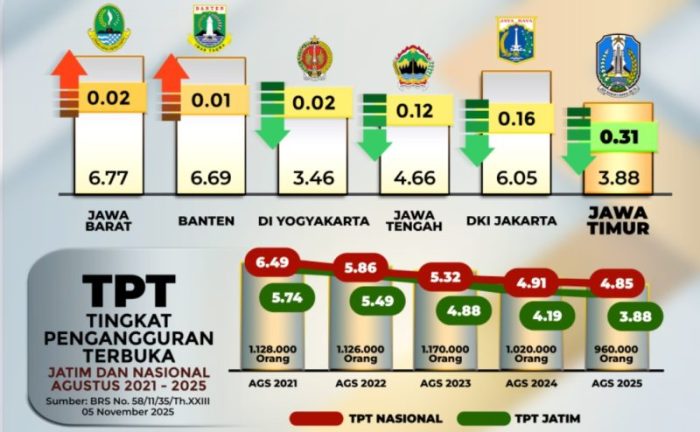Selama lima tahun terakhir, Jawa Timur mencatat tren penurunan TPT yang konsisten. Pada Agustus 2021, TPT Jatim berada di angka 5,74 persen, kemudian turun menjadi 5,49 persen pada 2022, 4,88 persen pada 2023, 4,19 persen pada 2024, hingga kini mencapai 3,88 persen pada 2025.