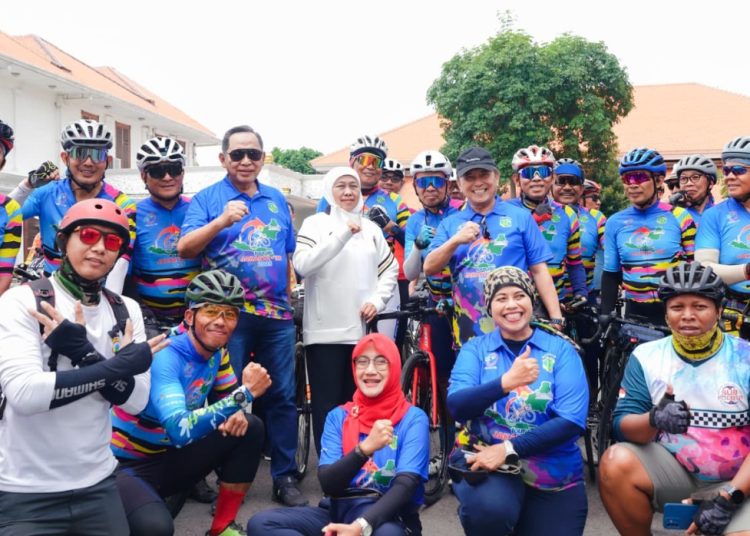 SURABAYATODAY.ID, SURABAYA – – Gubernur Jawa Timur Khofifah Indar Parawansa menyambut para peserta gowes Tour de’ Jakarta–IKN 2025 yang memasuki garis finis etape keempat dari Tuban menuju Surabaya di Gedung Negara Grahadi, Surabaya, Minggu (16/11).