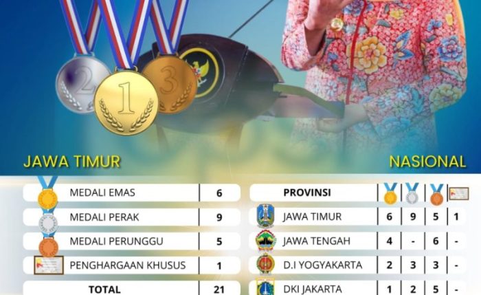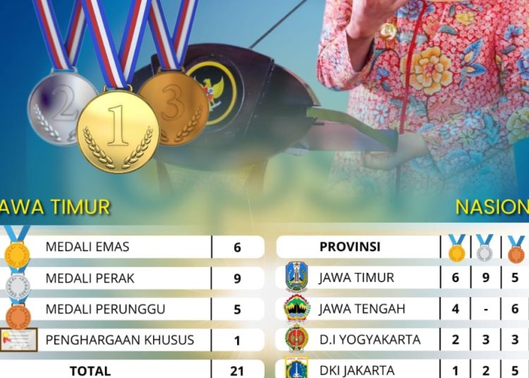 Dalam gelaran OPSI Nasional sejak 10-16 November 2025 ini, Jatim memborong total 21 medali, terdiri dari 6 Medali Emas, 9 Medali Perak, 5 Medali Perunggu, dan 1 penghargaan khusus budaya lokal.