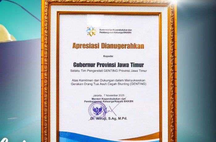 “Penghargaan Genting ini adalah buah dari sinergi semua pihak baik pemerintah provinsi, pemerintah kabupaten/kota, desa, Perwakilan BKKBN Prov. Jawa Timur, PKK, Mitra Pentahelix, serta Pembina Posyandu yang terlibat dalam Gerakan Orang Tua Asuh Cegah Stunting masyarakat. Ini kerja gotong royong untuk masa depan generasi Jatim,” ujar Khofifah di Surabaya, Rabu (19/11) di tengah kunker misi dagang Jawa Timur – Sulawesi Tenggara di Kendari Sulawesi Tenggara.