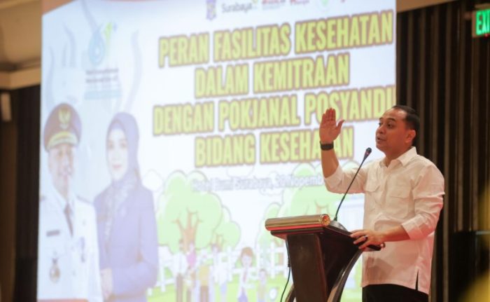SURABAYATODAY.ID, SURABAYA – Wali Kota Surabaya, Eri Cahyadi didampingi Bunda Posyandu, Rini Indriyani, menghadiri acara “Peran Fasilitas Kesehatan Dalam Kemitraan Dengan Pokjanal Posyandu Bidang Kesehatan” di Hotel Bumi, Kamis (20/11/2025). Acara ini dihadiri oleh 160 peserta yang terdiri dari 66 rumah sakit, 63 kepala puskesmas, serta perwakilan PKK dan Perhimpunan Rumah Sakit Seluruh Indonesia (PERSI).