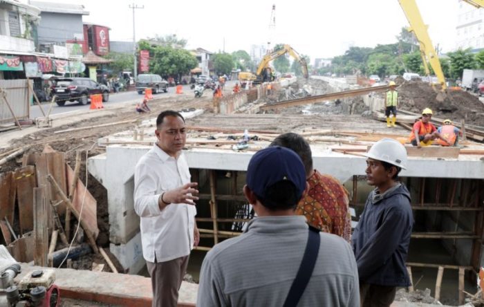 Wali Kota Surabaya Eri Cahyadi saat mengecek proyek pelebaran saluran dan pembangunan rumah pompa di Jalan Raya Prapen, Panjang Jiwo, Surabaya.