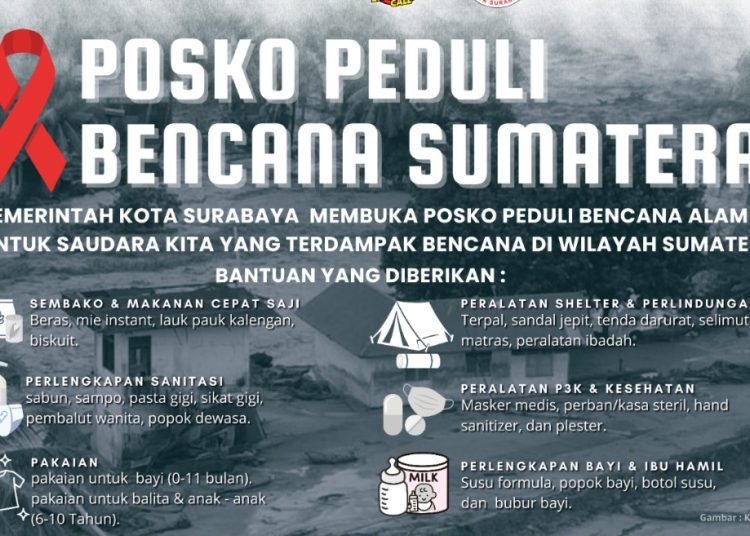 SURABAYATODAY.ID, SURABAYA – Pemerintah Kota (Pemkot) Surabaya melalui Badan Penanggulangan Bencana Daerah (BPBD) membuka Posko Peduli Bencana di Taman Surya, Balai Kota. Posko peduli bencana banjir dan longsor di wilayah Aceh, Sumatera Utara, dan Sumatera Barat ini telah dibuka di sejak Jumat (28/11/2025) malam.