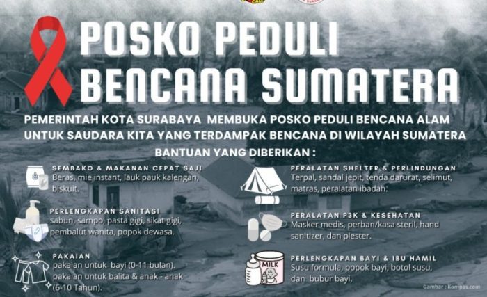 Selain itu, dalam bencana ini juga dibutuhkan peralatan P3K dan kesehatan seperti masker, hand sanitizer, plester, obat diare, paracetamol, dan vitamin. “Warga Surabaya juga bisa menyalurkan bantuan dalam bentuk perlengkapan bayi dan ibu hamil. Mulai dari susu formula, botol susu, bubur bayi, popok serta pakaian untuk bayi usia 0-11 bulan, dan pakaian anak-anak balita serta anak-anak usia 6-10 tahun,” jelas Irvan.