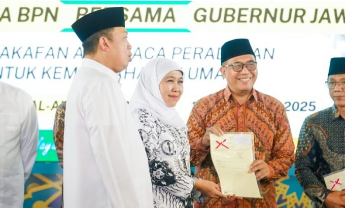 “Ada kepastian hukum dari seluruh bidang tanah yang diatasnya ada gedung baik itu milik institusi, perguruan tinggi, sekolah sekolah, badan-badan wakaf juga dan tentu milik tempat-tempat ibadah,” kata Gubernur Khofifah.