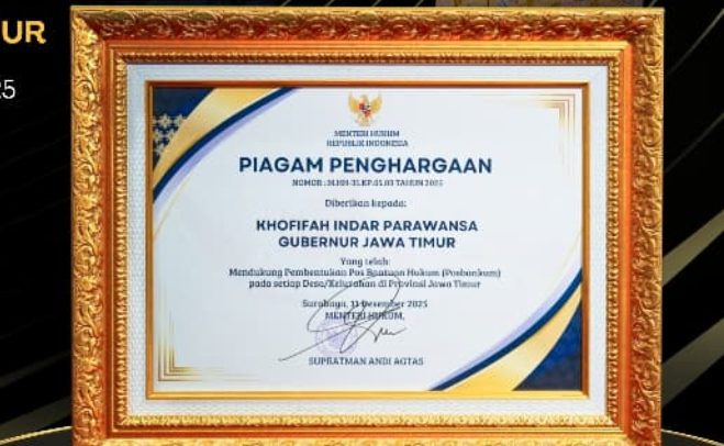 SURABAYATODAY.ID, SURABAYA – Gubernur Jawa Timur Khofifah Indar Parawansa menerima penghargaan dari Kementerian Hukum RI atas keberhasilan terbentuknya 8.494 Pos Bantuan Hukum (Posbankum) Desa/Kelurahan di seluruh Jawa Timur.