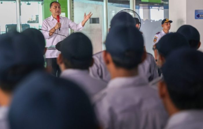 SURABAYATODAY.ID, SURABAYA – Wali Kota Surabaya Eri Cahyadi memimpin apel pagi bersama jajaran Dinas Perhubungan (Dishub), para driver dan helper Suroboyo Bus serta Feeder Wira-Wiri, hingga juru parkir di Terminal Intermoda Joyoboyo (TIJ), Selasa (30/12/2025). Dalam arahannya, Wali Kota Eri menekankan peningkatan kewaspadaan, profesionalisme, serta komitmen bersama untuk memberantas pungutan liar (pungli) dalam layanan transportasi publik.