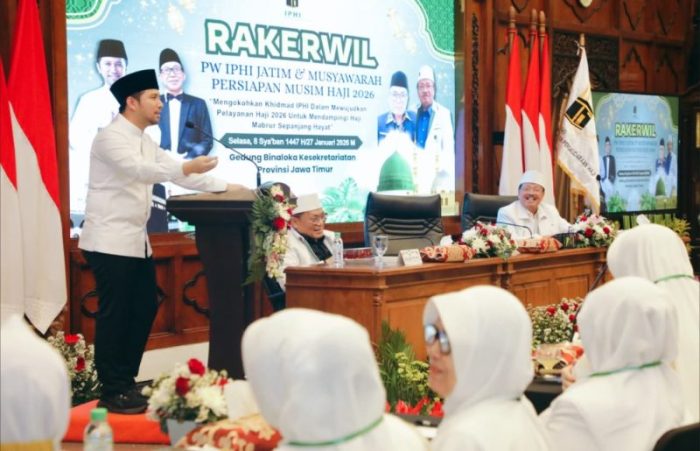 SURABAYATODAY.ID, SURABAYA – Wakil Gubernur Jawa Timur sekaligus Ketua Pengurus Wilayah Ikatan Persaudaraan Haji Indonesia (IPHI) Jawa Timur Emil Elestianto Dardak memberikan pengarahan dalam Rapat Kerja Wilayah (Rakerwil) PW IPHI Jawa Timur Tahun 2026 yang dirangkaikan dengan Musyawarah Persiapan Musim Haji 1447 H/2026 M. Kegiatan tersebut digelar di Ruang Bhinaloka Adikara Kantor Gubernur Jatim, Selasa (27/1).