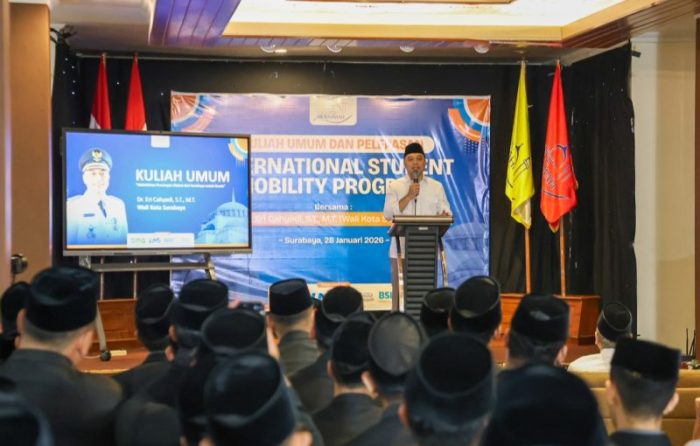 SURABAYATODAY.ID, SURABAYA – Wali Kota Surabaya, Eri Cahyadi, memberikan semangat dan arahan kepada ratusan mahasiswa Sekolah Tinggi Ilmu Dakwah dan Komunikasi Islam (STIDKI) Ar-Rahmah Surabaya di acara kuliah umum sekaligus pelepasan International Student Mobility Program, Rabu (28/1/2026). Dalam paparannya Wali Kota Eri Cahyadi menekankan bahwa dakwah adalah kunci utama perubahan bangsa melalui penguatan iman dan akhlak.