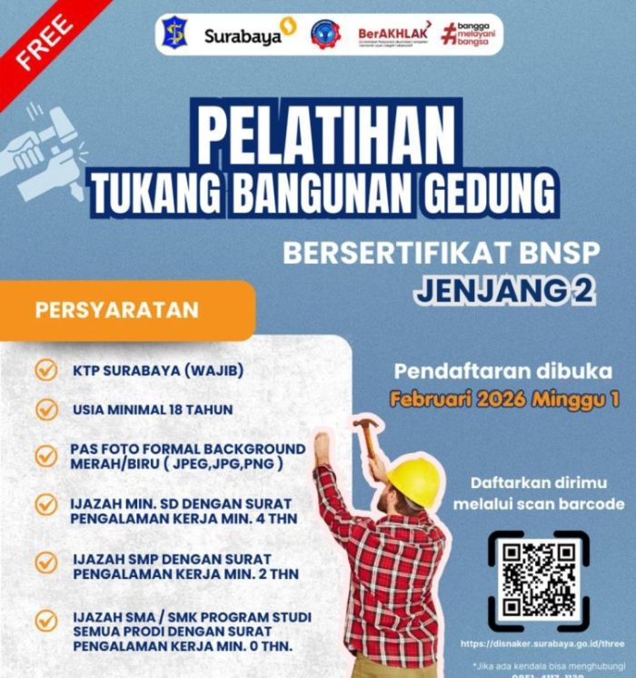 SURABAYATODAY.ID, SURABAYA –Pemerintah Kota (Pemkot) Surabaya melalui Dinas Perindustrian dan Tenaga Kerja (Disperinaker) resmi membuka pendaftaran Pelatihan Tukang Bangunan Gedung Bersertifikat Jenjang 2 mulai 1 Februari 2026. Program ini ditujukan bagi warga Surabaya yang ingin meningkatkan kompetensi sekaligus memperoleh sertifikasi resmi di bidang konstruksi.