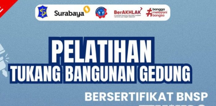 SURABAYATODAY.ID, SURABAYA –Pemerintah Kota (Pemkot) Surabaya melalui Dinas Perindustrian dan Tenaga Kerja (Disperinaker) resmi membuka pendaftaran Pelatihan Tukang Bangunan Gedung Bersertifikat Jenjang 2 mulai 1 Februari 2026. Program ini ditujukan bagi warga Surabaya yang ingin meningkatkan kompetensi sekaligus memperoleh sertifikasi resmi di bidang konstruksi.