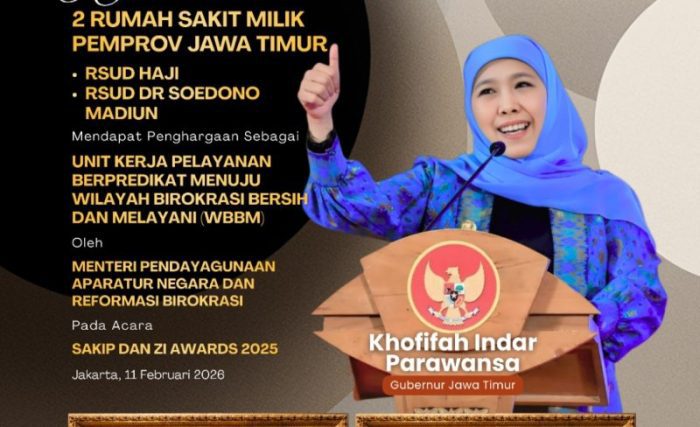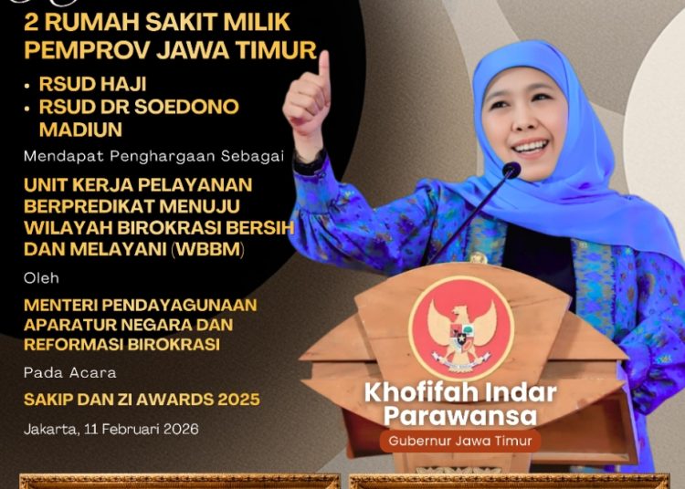 SURABAYATODAY.ID, JAKARTA – Dua Rumah Sakit Umum Daerah (RSUD) milik Pemerintah Provinsi Jawa Timur, yakni RSUD Haji Provinsi Jawa Timur dan RSUD Dr. Soedono Madiun, resmi meraih predikat Zona Integritas Menuju Wilayah Birokrasi Bersih dan Melayani (WBBM) dalam ajang SAKIP dan Zona Integritas (ZI) Award 2025 yang diselenggarakan Kementerian Pendayagunaan Aparatur Negara dan Reformasi Birokrasi (PANRB) di Jakarta, Rabu (11/2).