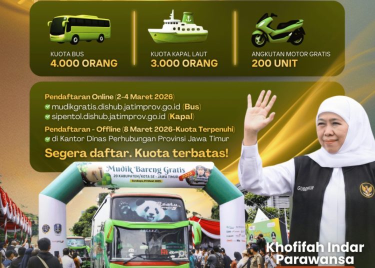 SURABAYATODAY.ID, SURABAYA – Gubernur Jawa Timur Khofifah Indar Parawansa kembali menggelar program Mudik Gratis Hari Raya Idul Fitri 1447 Hijriah Tahun 2026. Program ini menjadi wujud komitmen Pemprov Jatim dalam memberikan layanan transportasi yang aman, nyaman, dan bebas biaya bagi masyarakat yang ingin pulang ke kampung halaman.