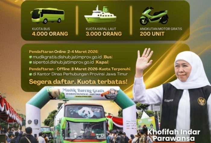 Dikarenakan terbatasnya kuota, Gubernur Khofifah mengajak masyarakat untuk segera memanfaatkan program Mudik Gratis ini dengan melakukan pendaftaran sesuai jadwal yang telah ditentukan melalui laman pendaftaran Bus mudikgratis.dishub.jatimprov.go.id dan Kapal Lautsipentol.dishub.jatimprov.go.id