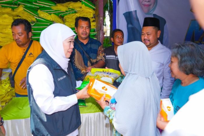 Tak hanya menyediakan kebutuhan pokok dengan harga terjangkau, Gubernur Khofifah juga ikut membagikan bantuan pangan berupa beras bagi para lanjut usia, serta telur bagi ibu hamil dan anak-anak sebagai bagian dari upaya pemenuhan gizi keluarga.