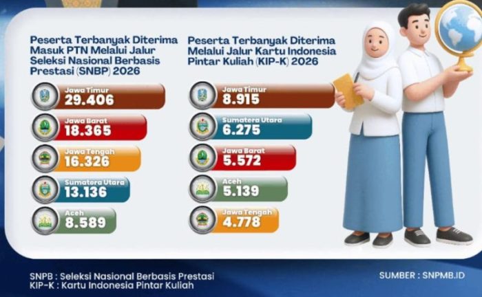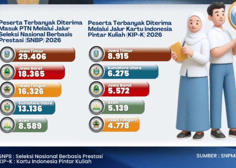 Berdasarkan pengumuman resmi data SNBP 2026 di snpmb.id yang dirilis Selasa (31/3), sebanyak 29.046 siswa asal Jawa Timur diterima dari total 108.122 pendaftar. Posisi kedua ditempati Jawa Barat dengan 18.365 siswa diterima dari 130.373 pendaftar, disusul Jawa Tengah dengan 16.326 siswa diterima dari 99.825 pendaftar.