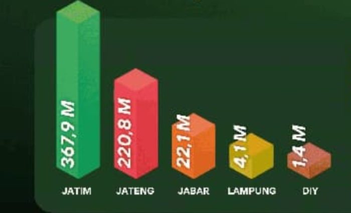 Kabupaten Trenggalek mencatatkan nilai tertinggi sebesar Rp185,35 miliar, diikuti Kabupaten Lamongan Rp22,15 miliar, Kabupaten Blitar Rp20,74 miliar, Kabupaten Probolinggo Rp19,03 miliar, serta Kabupaten Lumajang Rp17,82 miliar.