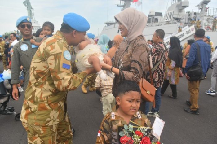 Begitu kapal bersandar, suasana haru tak terhindarkan. Satu per satu prajurit turun, disambut pelukan erat dari keluarga yang telah lama menanti. Beberapa ibu tak kuasa menahan air mata, anak-anak berlari dengan gembira, sementara istri dan suami saling berpegangan tangan, seakan ingin memastikan bahwa pertemuan ini bukan mimpi.