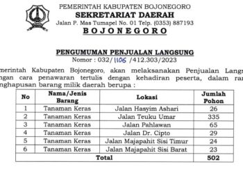 SURABAYATODAY.ID, BOJONEGORO - Pemerintah Kabupaten Bojonegoro melalui Badan Pengelolaan Keuangan dan Aset Daerah (BPKAD) melelang 502 pohon peneduh di wilayah ...