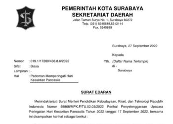 Pemkot Surabaya Keluarkan SE Pedoman Hari Kesaktian Pancasila Tahun 2022